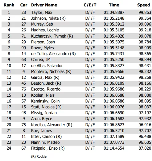 Driving the No. 28 Andretti Global entry—the same chassis Dennis Hauger piloted to the 2025 title—Taylor clocked a blistering 1:04.8887 on his final lap.