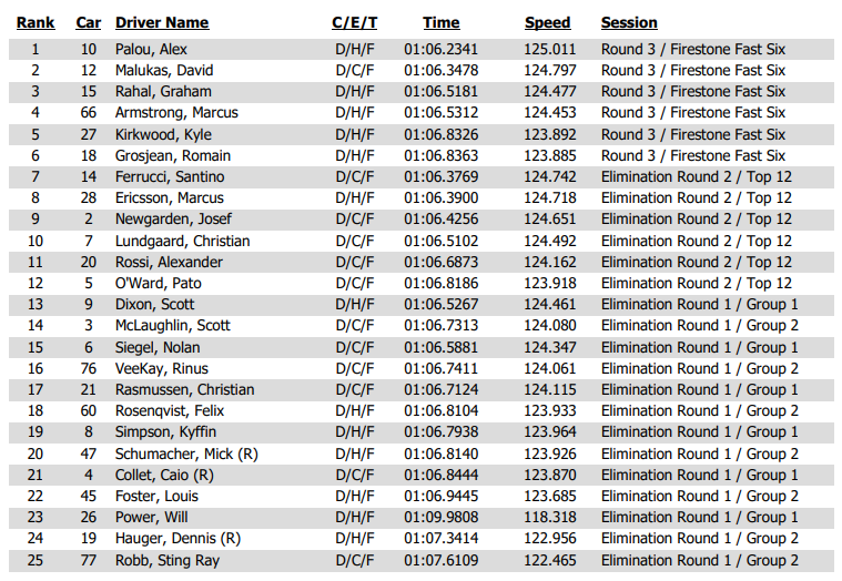 There was tremendous team parity in the starting lineup, as seven different organizations were represented among the top seven qualifiers. Santino Ferrucci will start seventh for AJ Foyt Racing, as Andretti Global is the first repeat team on the grid with Marcus Ericsson qualifying eighth.