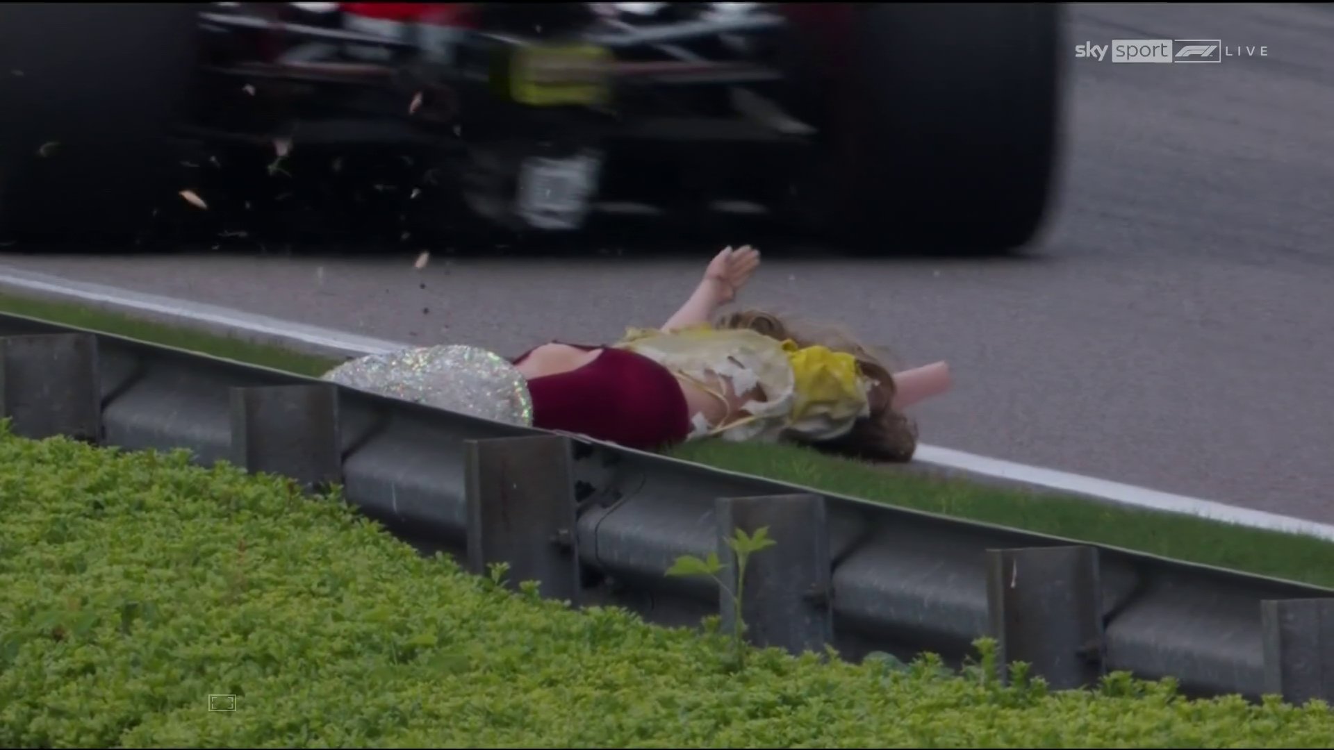 During Sunday’s NTT IndyCar race Georgina, a mannequin, fell from the overpass bridge landing just off the track. She was subsequently hit by a car.